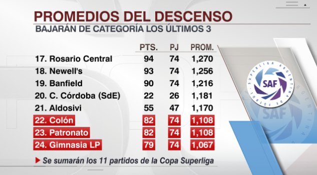 Y detalló en la mañana del colador que, no habrá tres descensos como estaba previsto. Perderían la categoría los dos peores promedios, y el tercer peor promedio jugará una promoción contra un equipo de la Primera Nacional. Con esta modificación, Gimnasia LP estaría descendiendo hoy y se jugaría un partido desempate entre Patronato y Colón para decidir qué equipo baja y cuál es el que juega la promo.