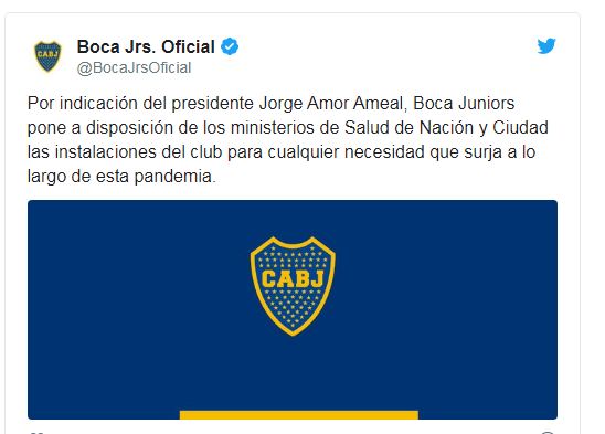 Casi todos los clubes ofrecieron sus instalaciones para ser usados en caso de que la pandemia siga azotando a Argentina. Boca, River y San Lorenzo fueron los primeros. Luego se sumaron Newell's, Rosario Central y Banfield. El club presidido por Marcelo Tinelli ofreció las "instalaciones de la Ciudad Deportiva para la atención de los pacientes con coronavirus". Por su parte, Boca aseguró: "ponemos disposición de los ministerios de Salud de Nación y Ciudad las instalaciones del club para cualquier necesidad que surja a lo largo de esta pandemia".