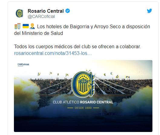 Para finalizar, los dos clubes más grandes de Rosario brindaron su ayuda. El Canalla comunicó: "El club pone a disposición sus hoteles tanto en la Ciudad Deportiva de Granadero Baigorria, como el del predio donde entrena y concentra nuestro primer equipo (de fútbol), en la ciudad de Arroyo Seco". Newell's hizo lo mismo con el predio de Ricardone (en la afueras de la ciudad de Rosario) y ofreció la ayuda de los equipos médicos del club.