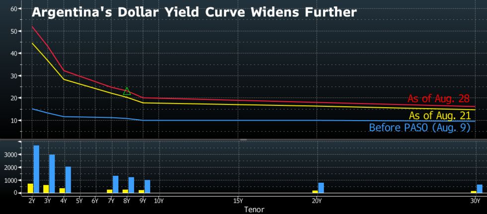 Mientras tanto, las reservas de dólares de la nación se están debilitando. Las reservas de divisas han caído a $ 57.5 mil millones después de una victoria aplastante para la oposición en las primarias del 9 de agosto que sacudió los mercados, enviando acciones a la baja junto con el peso y los bonos.
