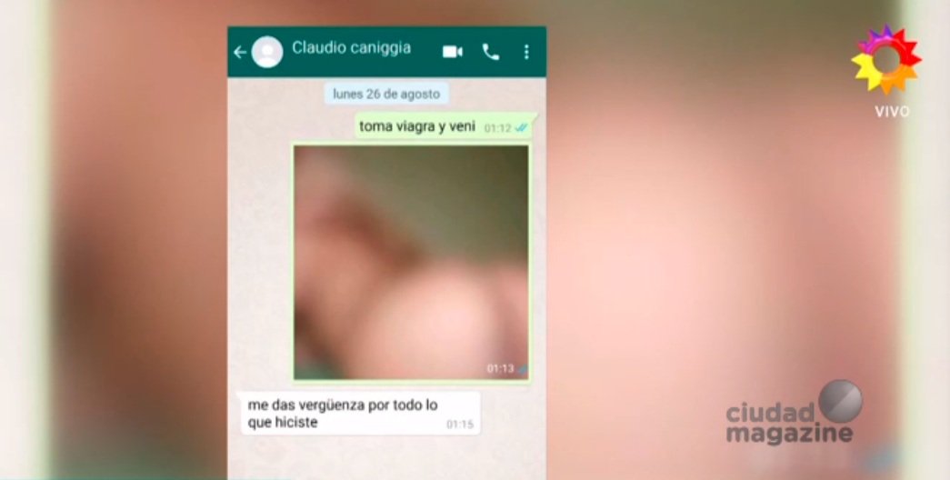 El primero de esos chats, según mostraron en "El diario de Mariana", que fue el del 26 de agosto, consiste en una foto hot Mariana a Claudio y el texto: ‘Tomá Viagra y vení’. Él le contesta ‘Me das vergüenza por todo lo que hiciste’.