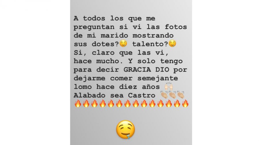La actriz deslizó que las fotografías de su pareja son viejas, y descartando cualquier tipo de problema marital o rumores de infidelidad, terminó su publicación con ardientes elogios hacia él. “Sí, claro que las vi. Hace mucho. Y solo tengo para decir ‘GRACIAS DIO’ por dejarme comer semejante lomo desde hace diez años. Alabado sea Castro”, sentenció la rubia, volviendo a agregar emojis, en este caso, de fuegos y aplausos dedicados hacia su marido.