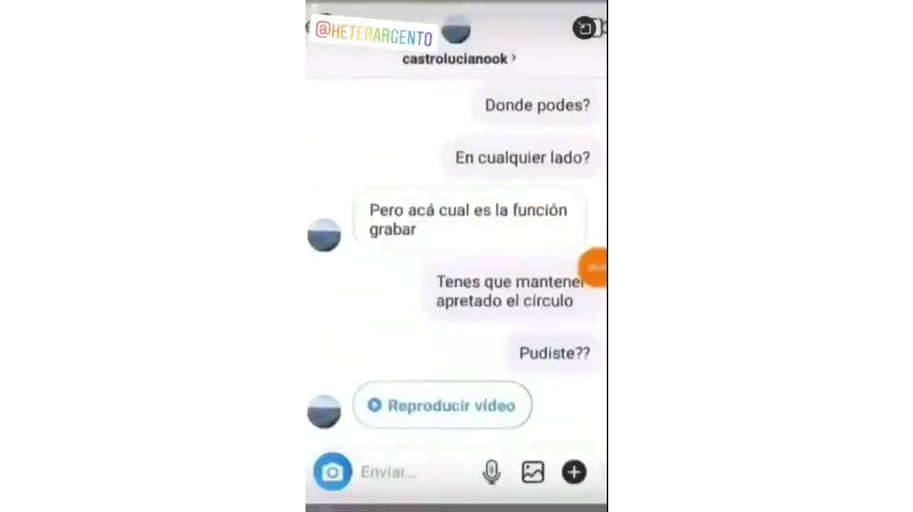 Ahora se conoció una nueva fotografía del galán de Pequeña Victoria, una conversación mediante los mensajes privados de Instagram en la que el actor pregunta:: "¿Acá cual es la función para grabar?”. En el video, si bien no se ve la cara de Luciano, sí se lee su usuario de la red social. Las imágenes son muy fuertes, y se ve una masturbación masculina.