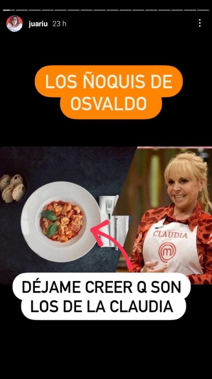 Ahora, y luego de que ella fuera a verlo tocar en vivo con su banda, un nuevo gesto 2.0 los acerca. Fue la periodista Juariu quien compartió una captura en donde se puede ver un plato de comida que Osvaldo posteó en sus redes. Pero no cualquier alimento, sino que un plato abundante de ñoquis, muy similares a los que Claudia Villafañe vendió la última semana.