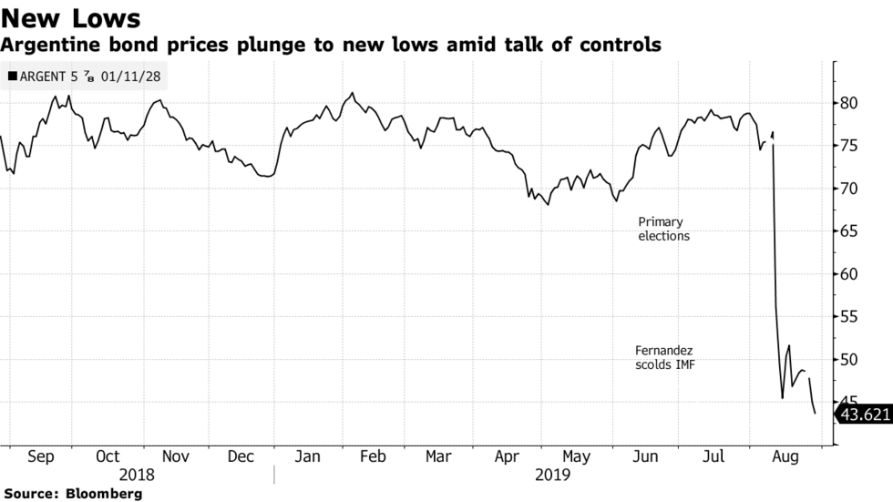 Los mercados financieros de Argentina se han desplomado desde que un impactante resultado primario el 11 de agosto mostró que el presidente Mauricio Macri estaba detrás de su rival izquierdista 15 puntos porcentuales antes de las elecciones del 27 de octubre. La próxima administración se haría cargo el 10 de diciembre.