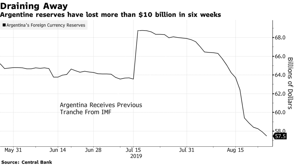 Las reservas en moneda extranjera se han desplomado más de $ 10 mil millones en el último mes a medida que los responsables políticos buscaron apuntalar el peso después de las primarias.