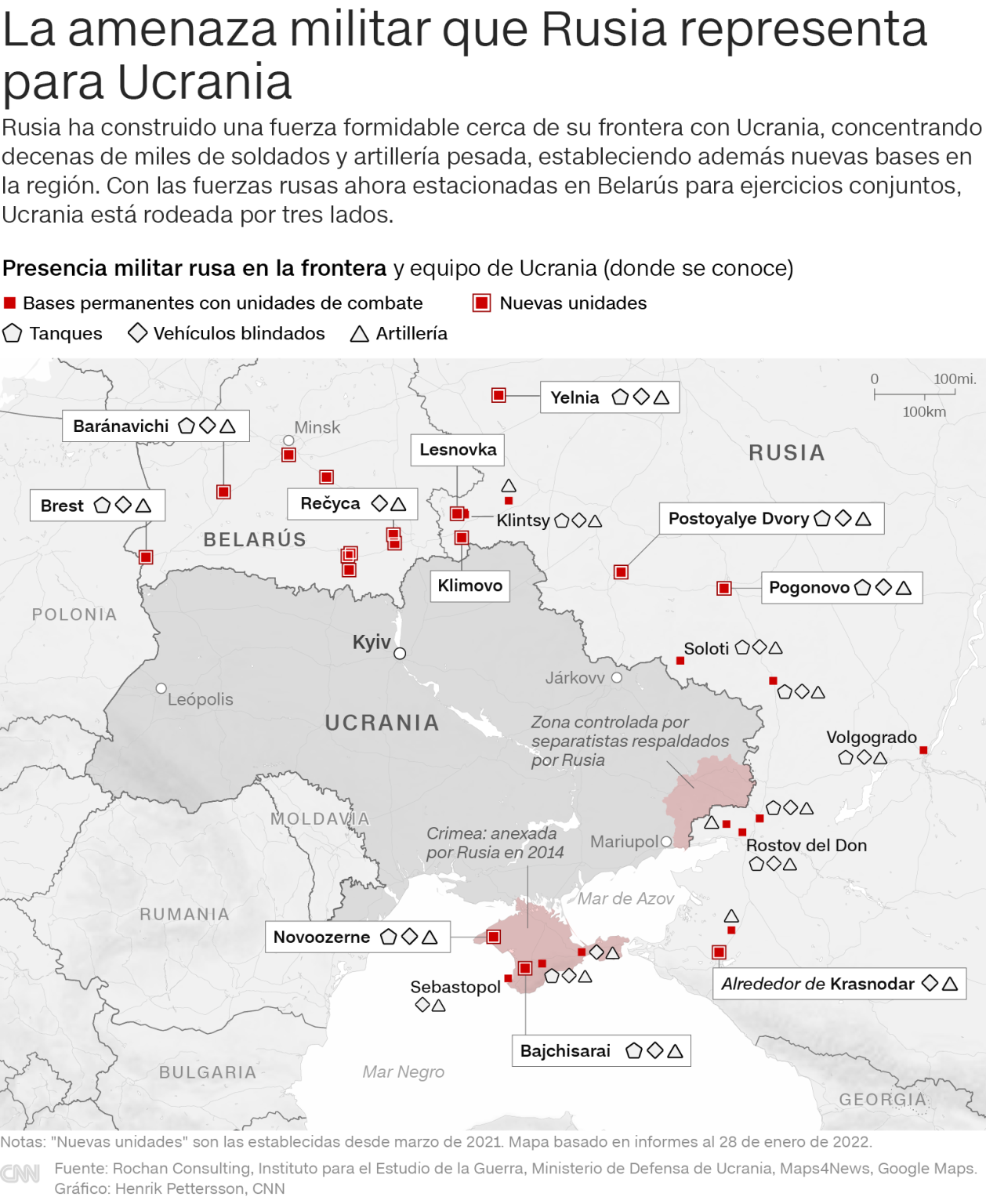 Biden y los líderes europeos advirtieron que Rusia sufriría graves consecuencias, incluidas sanciones, si Putin sigue adelante con una invasión. Pero eso no ha impedido que Rusia continúe reforzando sus posiciones militares. A fines de 2021 y principios de 2022, las imágenes satelitales revelaron nuevos despliegues rusos de tropas, tanques, artillería y otros equipos en múltiples lugares, incluido el este de Ucrania, Crimea y Belarús, donde sus fuerzas participaban en ejercicios conjuntos con el aliado internacional más cercano de Moscú.