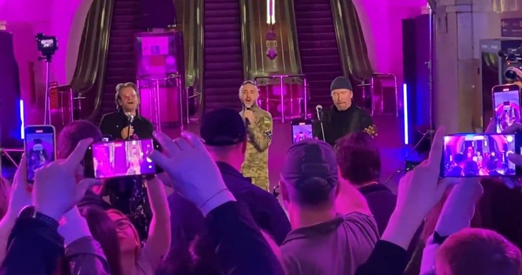 Los líderes del grupo irlandés U2, el cantante Bono y el guitarrista The Edge, ofrecieron el domingo un concierto sorpresa en la estación de subte de Khreschaty, en Kiev, en respuesta a una invitación que le había realizado el presidente de Ucrania, Volodimir Zelenski, a la banda para que actúe en su país.
