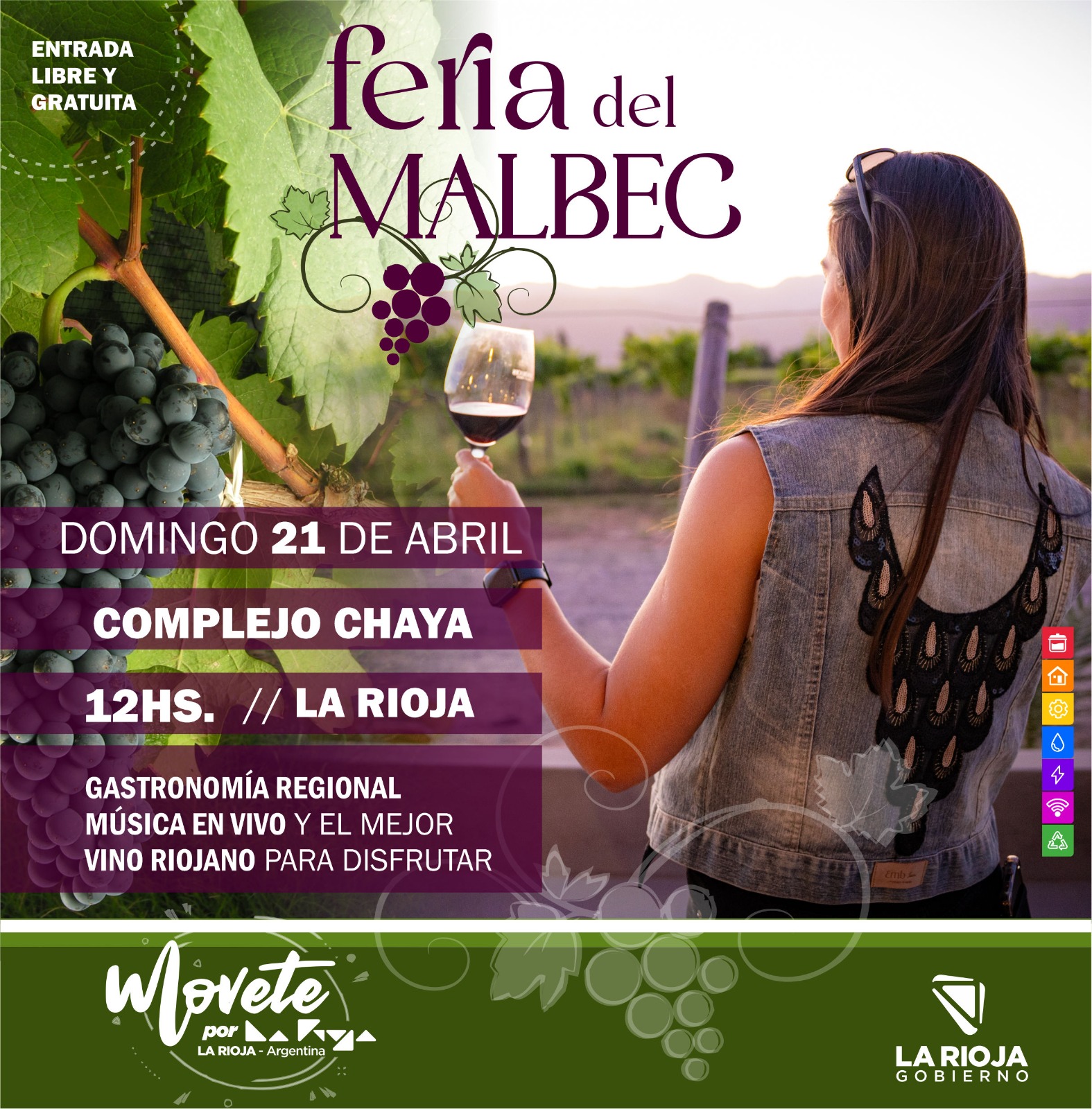 Como cierre de semana, el domingo 21 de abril el Complejo Chaya será escenario en el que se desarrollará la Feria del Malbec a partir de las 12 hs. con entrada libre y gratuita. Allí disfrutarán de una exquisita gastronomía regional, música en vivo, juegos, sorteos, degustaciones de vinos y el protagonista principal que es el Malbec riojano de la mano bodegas productoras.