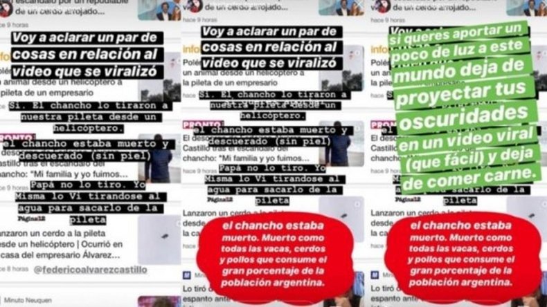 La joven respondió a las críticas que recibió en su perfil de Instagram, después de que se hiciera público el video en el que se los puede escuchar reírse en familia mientras un helicóptero arroja al animal a la pileta de la casa de Punta del Este en la que veranean. "El chancho estaba muerto", aclaró la adolescente, al tiempo que sumó: "Muerto como todas las vacas, cerdos y pollos que consume el gran porcentaje de la Argentina".