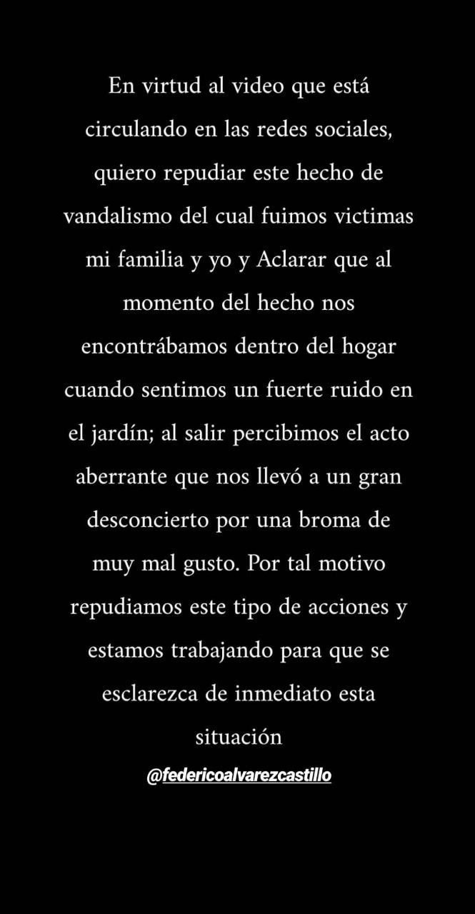 “En virtud al video que está circulando en las redes sociales, quiero repudiar este hecho de vandalismo del cual fuimos víctimas mi familia y yo; y aclarar que al momento del hecho nos encontrábamos dentro del hogar cuando sentimos un fuerte ruido en el jardín”.