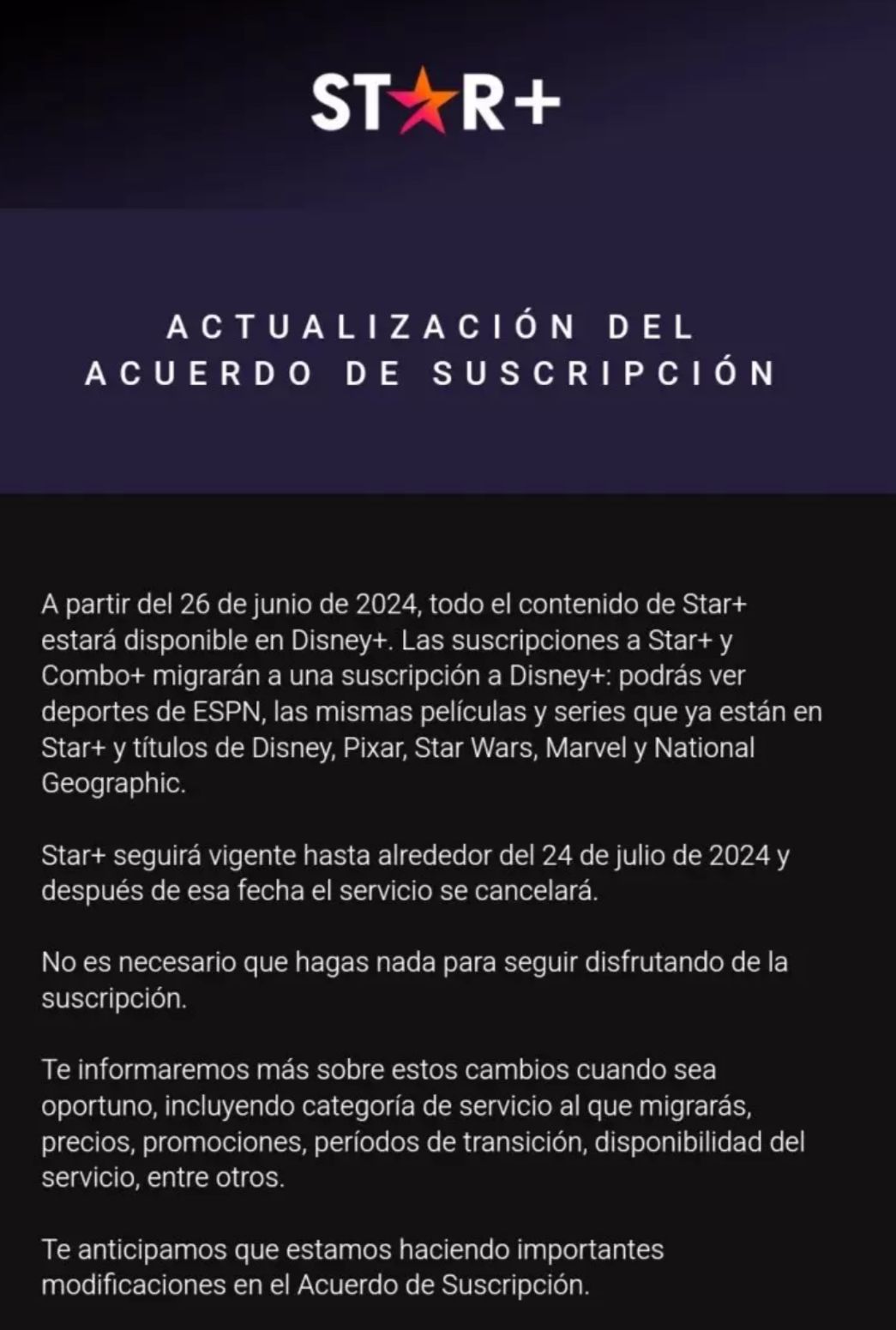 En el documento que le enviaron a todos los usuarios de la plataforma, aclararon que "Star+ seguirá vigente hasta alrededor del 24 de julio de 2024 y después de esa fecha el servicio se cancelará". "No es necesario que hagas nada para seguir disfrutando de la suscripción. Te informaremos más sobre estos cambios cuando sea oportuno, incluyendo categoría de servicio al que migrarás, precios, promociones, períodos de transición, disponibilidad del servicio, entre otros", destacaron.