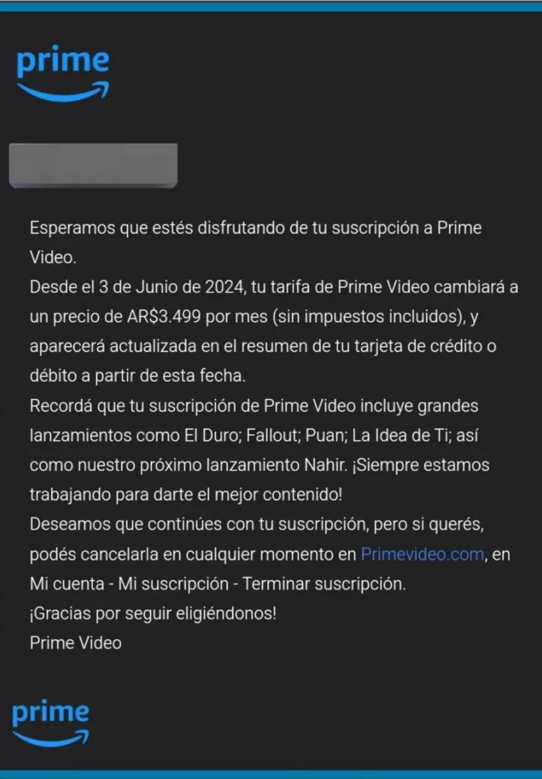 Desde Amazon anunciaron este ajuste de la siguiente manera: "Desde el 3 de Junio de 2024, tu tarifa de Prime Video cambiará a un precio de AR$3.499 por mes (sin impuestos incluidos), y aparecerá actualizada en el resumen de tu tarjeta de crédito o débito a partir de esta fecha. Deseamos que continúes con tu suscripción, pero si querés, podés cancelarla en cualquier momento en Primevideo.com, en Mi cuenta - Mi suscripción - Terminar suscripción".